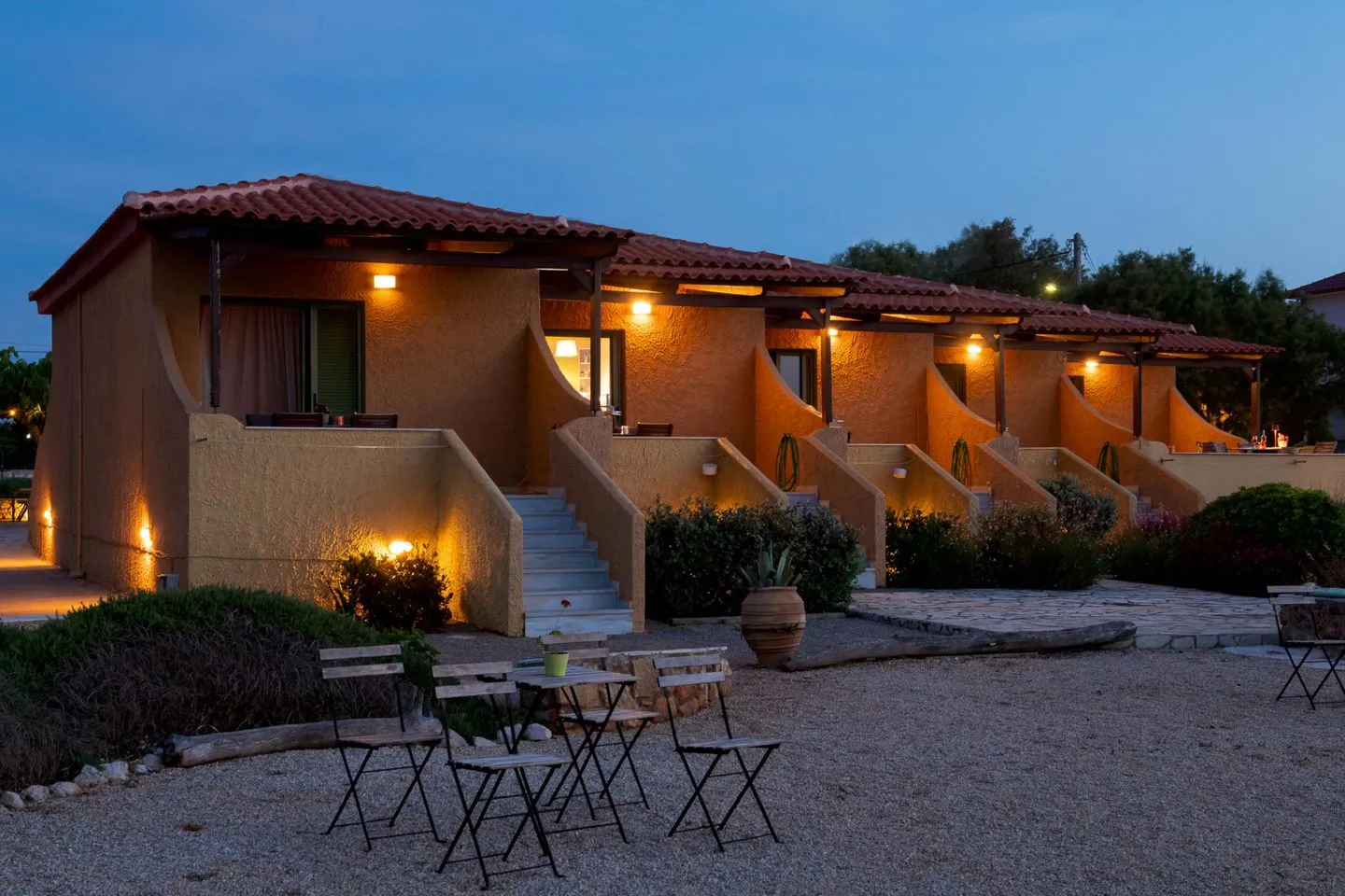 Die 1985 erbauten Esperides-Häuser wurden 2008, 2018 und 2023 renoviert. Die Einrichtung ist schlicht und farbenfroh gestaltet und vermittelt eine warme, gemütliche Atmosphäre. Im Außenbereich dominieren erdige Farben sowie natürliche, lokale Materialien. Von der vorderen Terrasse mit Gartenmöbeln gelangt man direkt in den Garten mit herrlichem Ausblick auf das Meer und die Küstenlandschaft – und mit direktem Zugang zum Wasser. An das Wohnzimmer mit Sofa und zwei Einzelbetten schließen sich die offene Küchenzeile, das Schlafzimmer und das Bad an. Vom Wohnzimmer führt ein direkter Ausgang auf die vordere, überdachte Terrasse mit traumhaftem Meerblick und mediterraner Umgebung, vom Schlafzimmer ein weiterer Ausgang auf die rückwärtige Terrasse.