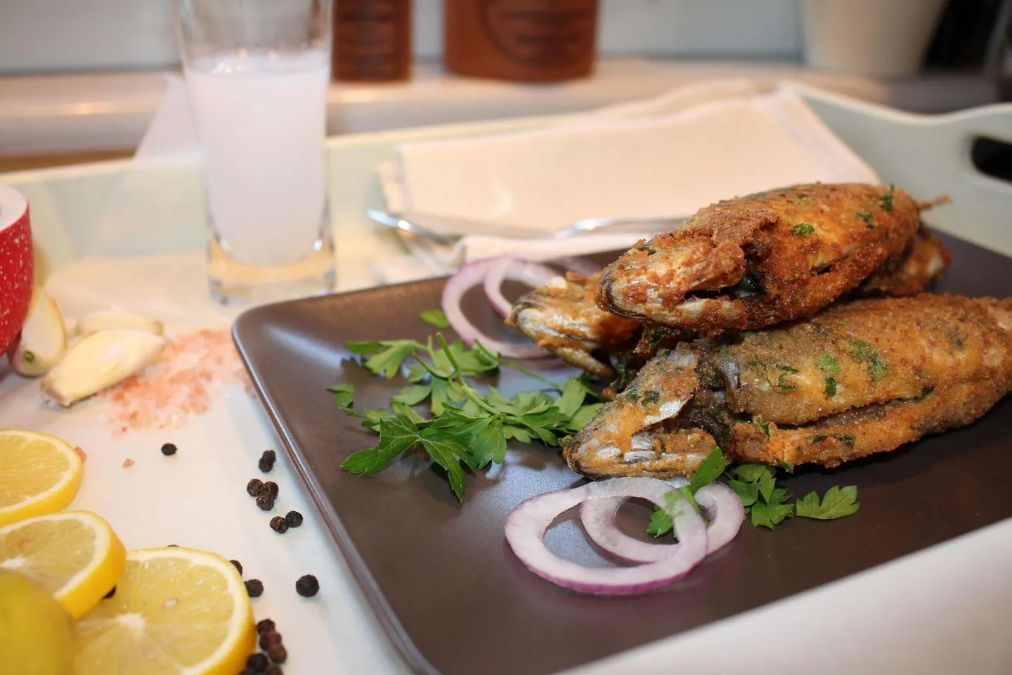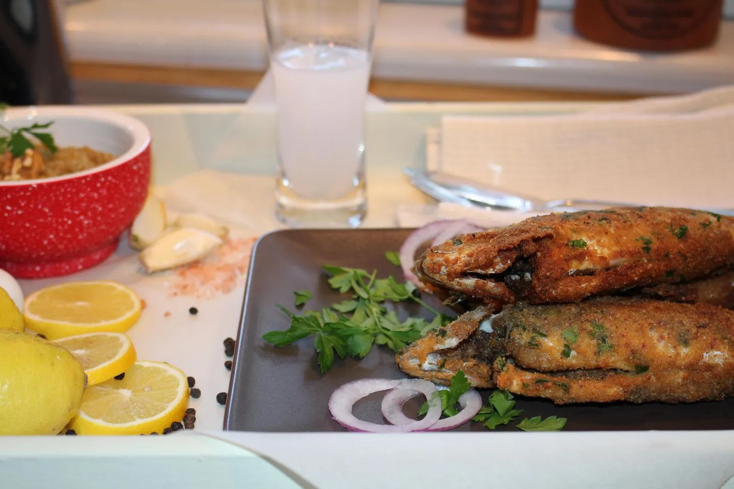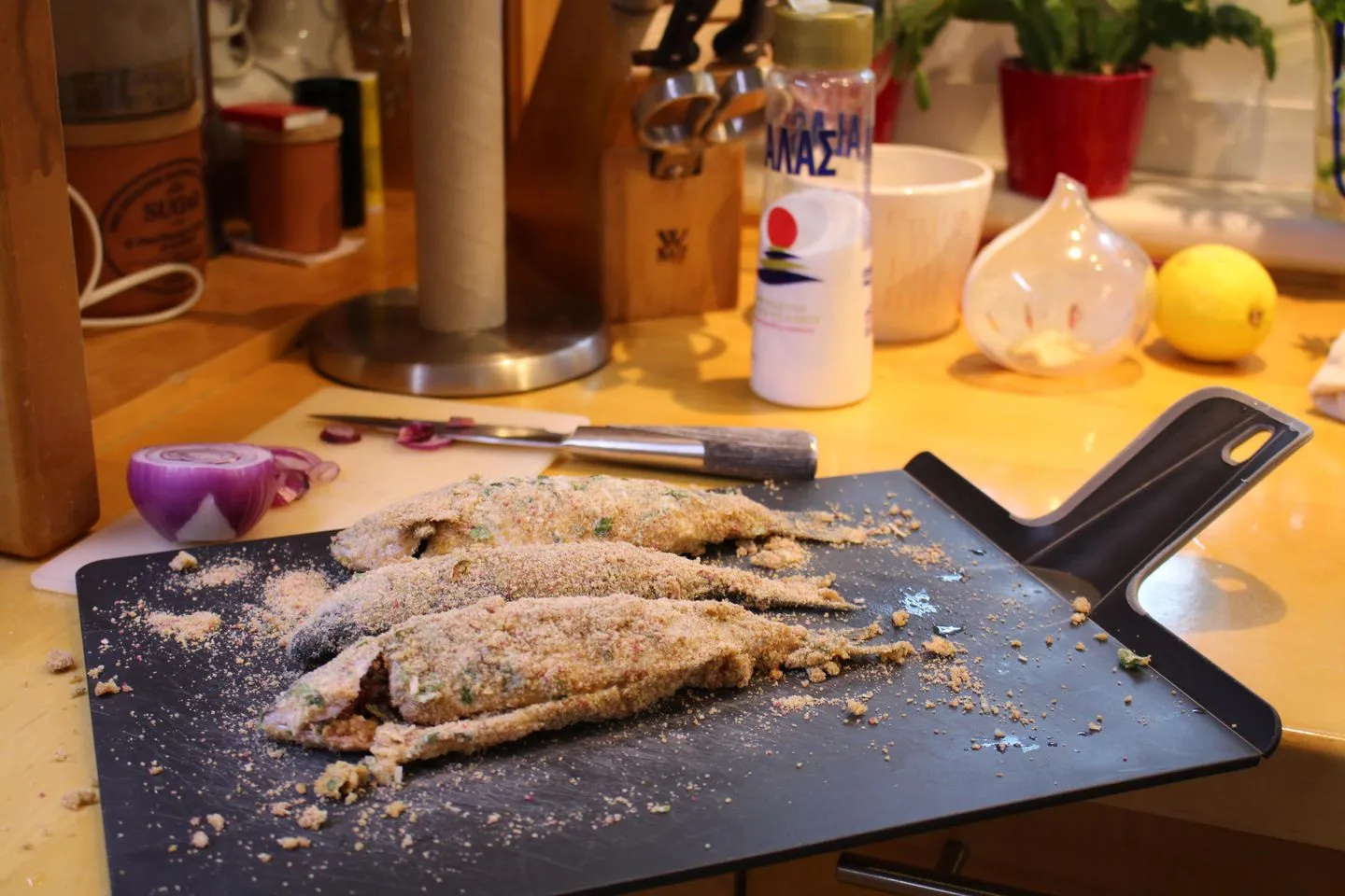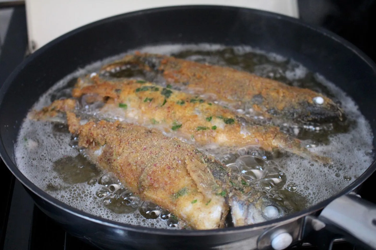 Die Fische ausspülen, trockentupfen salzen und pfeffern. Das Mehl mit der Petersilie, Paprika und dem Käse vermischen. Die Fische in der Mehlmischung wälzen, dann in den geschlagenen Eiern und anschließend in den Bröseln. In einer breiten Pfanne ausreichend Sonnenblumenöl, ca. 2,5 cm hoch, erhitzen, bis die Oberfläche unruhig wird. Die Fische hineinlegen, mit einer Gabel wenden und ca. 4-5 Minuten goldbraun braten. Zum abtupfen auf Küchenpapier legen und warm mit der Walnuss-Soße servieren.
