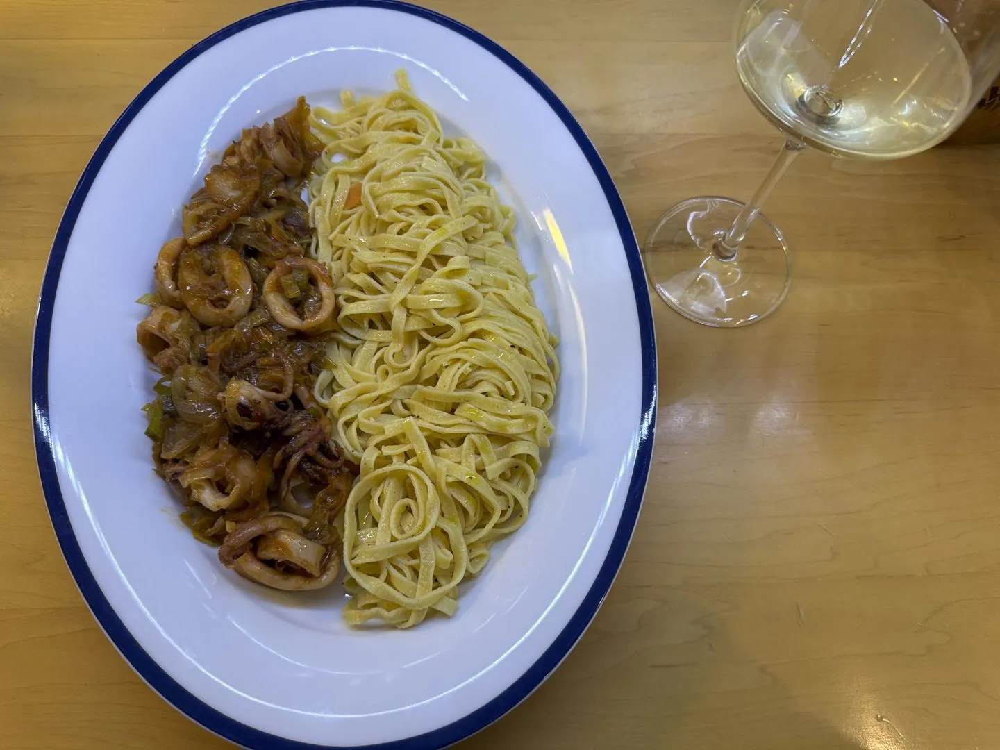 Die Kalamare (tiefgefrorene Kalamare vor der Zubereitung vollständig auftauen) ohne Zugabe von Fett oder Wasser in einem feuerfesten Topf auf höchster Stufe etwa 10 Minuten schmoren lassen, bis sie ihre gesamte Flüssigkeit abgegeben haben. Kalamare aus dem Topf nehmen, die Flüssigkeit abgießen und beiseitestellen. Im trockenen Topf etwas Olivenöl leicht erhitzen. Die Kalamare darin kurz anbraten, bis sie Farbe annehmen. Mit der Hälfte des Weins ablöschen, anschließend die beiseitegestellte Flüssigkeit zugeben und alles bei niedriger Hitze etwa 20 Minuten sanft schmoren lassen, bis die Kalamare weich sind. Beiseitestellen. Das restliche Olivenöl im Topf erhitzen. Zwiebeln, Lauch, Ingwer, Frühlingszwiebeln und Möhren bei mittlerer Hitze 10–15 Minuten langsam andünsten, bis alles weich ist. Tomatenmark unterrühren, mit dem restlichen Wein ablöschen, mit Salz, Pfeffer und Wacholderbeeren würzen und zugedeckt etwa 10 Minuten bei kleiner Hitze schmoren lassen. Die Kalamare zurück in den Topf geben und alles gemeinsam weitere 10 Minuten sanft schmoren lassen, damit sich die Aromen verbinden. Pasta als Beilage (optional): Die Nudeln nach Packungsanweisung kochen, abtropfen lassen und in einer Pfanne mit etwas Butter kurz schwenken. Zusammen mit dem Stifado Kalamaria servieren. Alternativ passt frisches Weißbrot hervorragend, um die aromatische Sauce aufzunehmen.